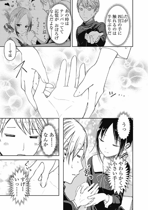 「恋愛は告白した方が負けなのである!」 エリートの集う秀知院学園生徒会で出会った会長・白銀御行と副会長・四宮かぐや…。この両想いであるはずの天才2人が、互いに相手に惚れさせ、相手から告白させようと日常の全てで権謀術数の限りを尽くす、新感覚のラブコメ!! 第8巻では、新メンバー伊井野ミコを迎えた、新生徒会が本格始動!! そんなミコの偏見(?)が、どんどん膨らむ程、かぐやと白銀の恋愛頭脳戦は急加速!? 中でも、体育倉庫イベントでは“かつてない程 熱烈なアタック”を仕掛けあい、キス目前に!? 2人の仲も進展か!?