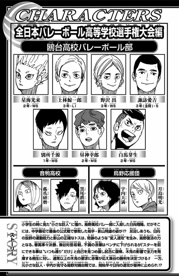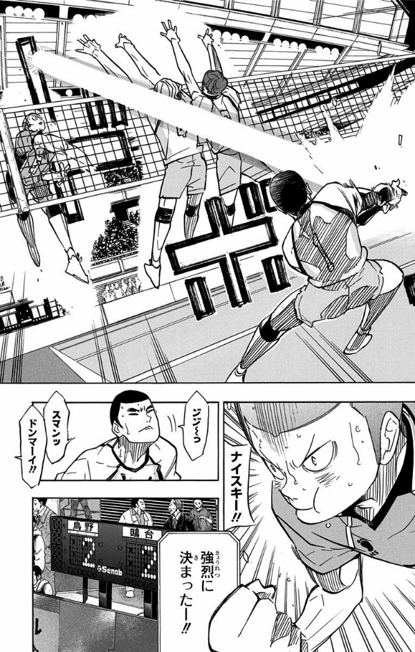 最小スパイカー、日向と星海が序盤から火花を散らす春高準々決勝! 鴎台は昼神を要とした高度な組織的ブロックで日向を阻み、烏野は月島が冷静な判断で星海を止める!! 試合は攻守競り合う熾烈な争いに…!?