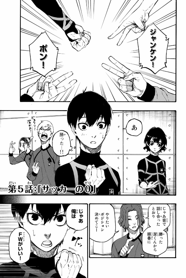 ブルーロック 5 2018年、W杯。日本代表は無残に散った。今大会もベスト16止まり…。アジアでは強豪? 組織力は世界レベル? そんなことは、もう聞き飽きた! 課題は、絶対的な「エースストライカー」の不在。悲願“W杯優勝”のために、ゴールに飢え、勝利に渇き、試合を一変させる革新的な“1人”を作るべく、日本フットボール連合は300人のユース年代の選手達を招集する。まだ無名の高校2年生・潔世一は、己のエゴを以って299人を蹴落とし、最強のエースストライカーの道を駆け上れるか!? 登場人物、全員“俺様”! 史上最もイカれたエゴイストFWサッカー漫画、ここに開幕!! 圧倒的な天才・凪の得点力を誇るチームV相手に、後半15分で3対3に追いついたチームZ。選手たちは次なる次元への“覚醒”を求め、自らのプレーを見つめ直すことに。潔は自分のプレーに潜む「無駄」の正体を解き明かし、強敵からゴールを奪うことができるのか!? 限界を超え、新たな武器でシュートを放て! 死闘・チームV戦、決着!!