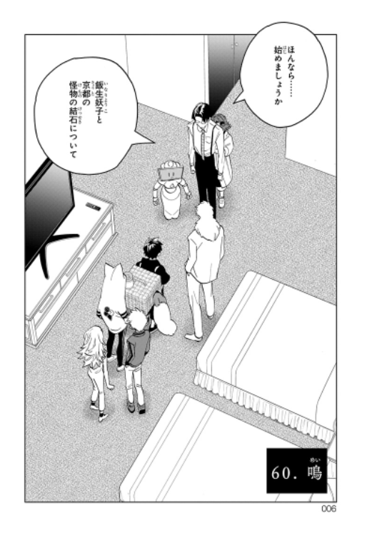 飯生の過去を調べるべく、京都の狐を探す夏羽たちは現地で怪物捜査を専門とする京都府公安警察『ゲンジ』のメンバーと会ってみることになったのでございます。ですが『ゲンジ』に所属する者は全員が人間であり、中でもリーダーの源頼電は狸について特別な心情があるようで…。京狐の棲家への潜入計画を練る『ゲンジ』は夏羽たちに手合わせを提案するのですが、人間と怪物…うまく交わるのでしょうか?