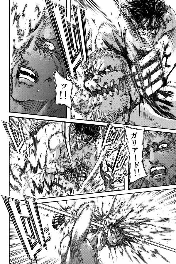 ジークがエレンに託した計画、それはエルディア人すべてを安楽死させるものだった。計画の鍵を握るのは始祖の巨人の力を持つエレンと、王家の血を引く巨人であるジークの接触。リヴァイら調査兵団による包囲網を突破し、ジークは自由の身となるが、そこにマーレ軍が現れる。エレンとジークの接触は果たされるのか……。