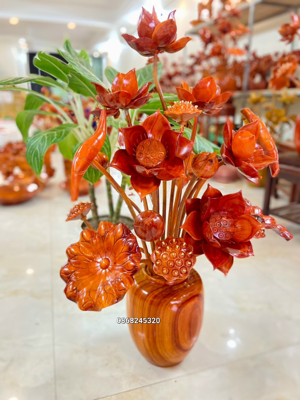 _ 1 bình hoa sen trang trí phòng khách phòng thờ được làm bằng chất liệu gỗ hương đỏ tự nhiên 100% _ Kt bình cắm cao 25×23cm +kt cao tổng hoa lá gương 82cm