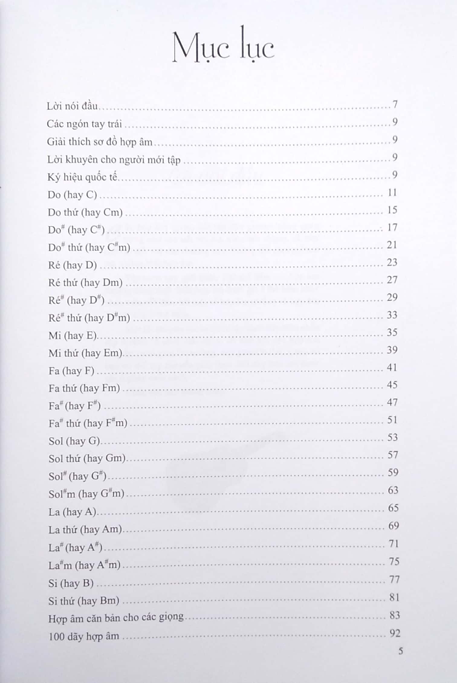 Sách giới thiệu 100 thế bấm các hợp âm thường dùng nhất. Mỗi hợp âm được ghi 4 thế bấm khác nhau trên cần đàn, trừ một số hợp âm trưởng và hợp âm 7 được cho 8 thế bấm.