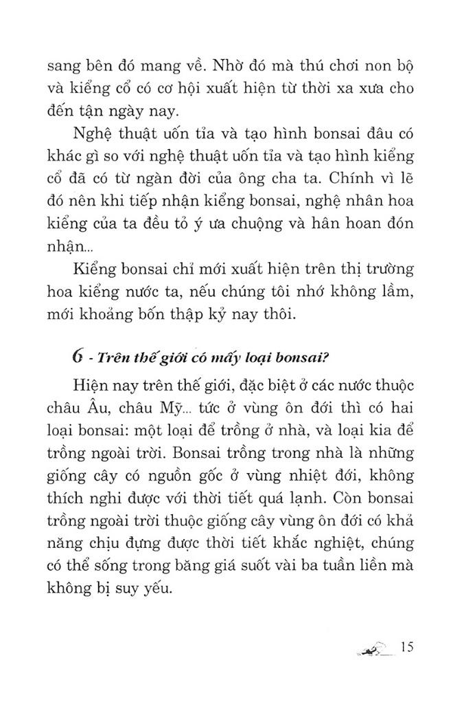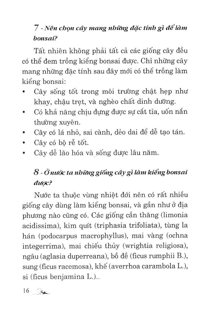 Mua tại Tiktok110 Câu Hỏi Đáp Chăm Sóc Và Tạo Dáng Bonsai Có nhiều quan niệm về Bonsai, trong khi người này xem Bonsai như là một trong những lẽ sống đầy ý nghĩa thiêng liêng cao cả của tư tưởng, triết học, tôn giáo, thì người khác lại xem đó chỉ là một thú vui lúc nhàn rỗi. Mỗi cây Bonsai là một tác phẩm nghệ thuật được lồng vào đó những kiến thức, ý tưởng và tình cảm của nghệ nhân tạo ra. Trong thời gian dài Bonsai là thú tiêu khiển của người quyền quý. Ngày nay được xem như là một nghệ thuật và cũng là một thú tiêu khiển của tất cả mọi người. Cuốn sách này sẽ cung cấp cho bạn đọc những bí quyết và phương cách chăm sóc, tạo dáng cho cây Bonsai của m.ình thêm đẹp mắt.