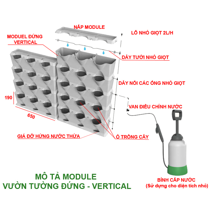 Ngang 65cm x Rộng 20cm x Cao 20cm (trồng được khá nhiều rau) Một Module có 1 nắp đậy để cố định chậu và 6 nút khóa Hệ thống tưới nhỏ giọt được cài vào bên trong từng cây rau sạch