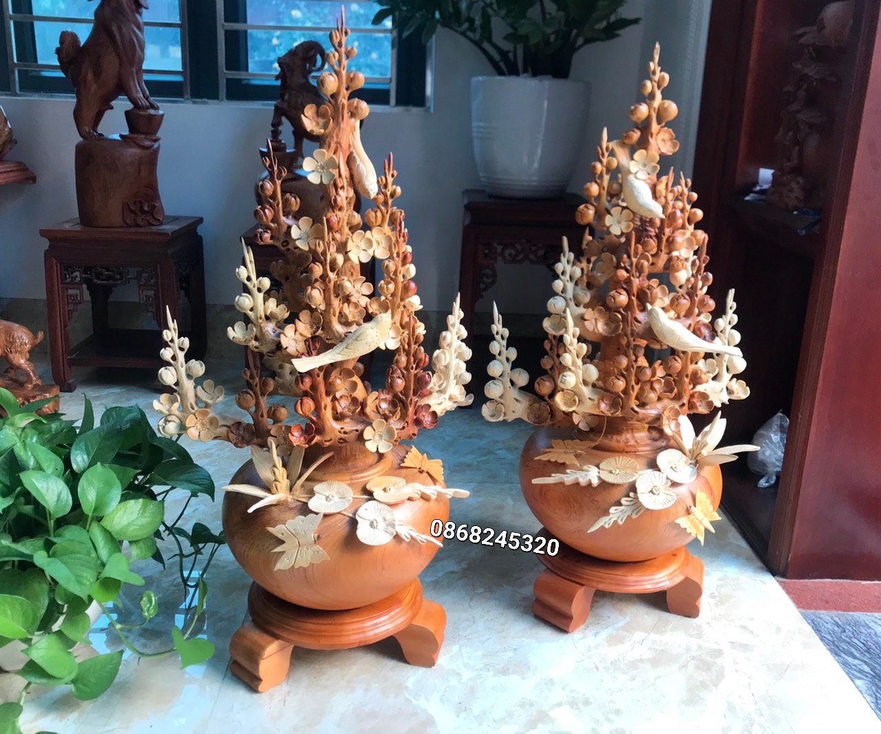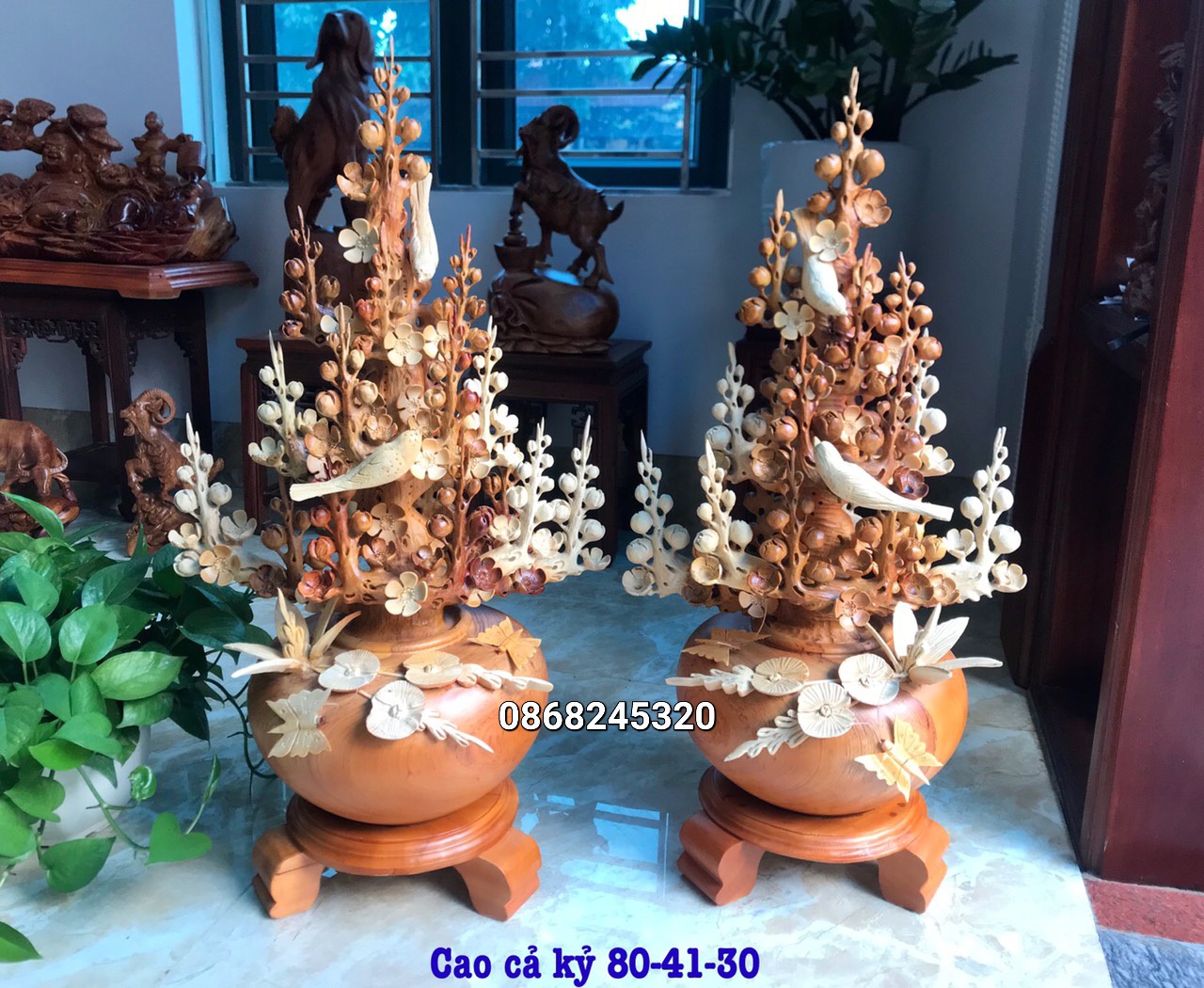 _ 2 bình hoa mai phú quý được làm bằng chất liệu gỗ hương tự nhiên 100% _ Kt tính cả kệ cao tổng 80×41×30cm _ 2 bình hoa mai được trạm khắc ,gọt tỉa