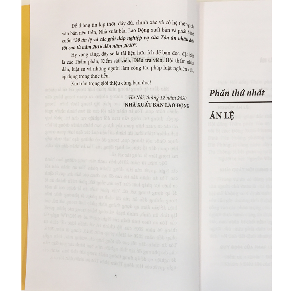 Để thông tin kịp thời, đầy đủ, chính xác và có hệ thống các văn bản nêu trên của Tòa án nhân dân tối cao, Nhà xuất bản Lao động xuất bản và phát hành cuốn sách: "39 Án lệ và giải đáp nghiệp vụ của Toà án nhân dân tối cao từ năm 2016 đến năm 2020"