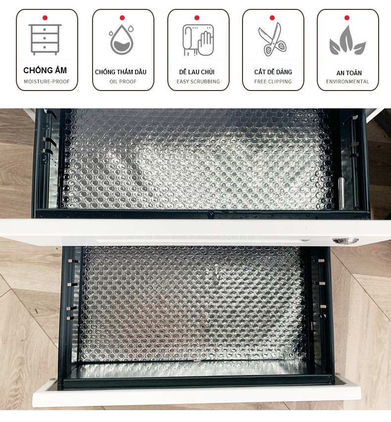 CUỘN GIẤY BẠC DÁN BẾP - Chất liệu: Giấy tráng nhôm cách nhiệt - Kích thước:2mx60cm; 3mx60cm - Màu sắc: Bạc - Đặc điểm: Tráng nhôm cách nhiệt, không bám dính dầu mỡ, không thấm