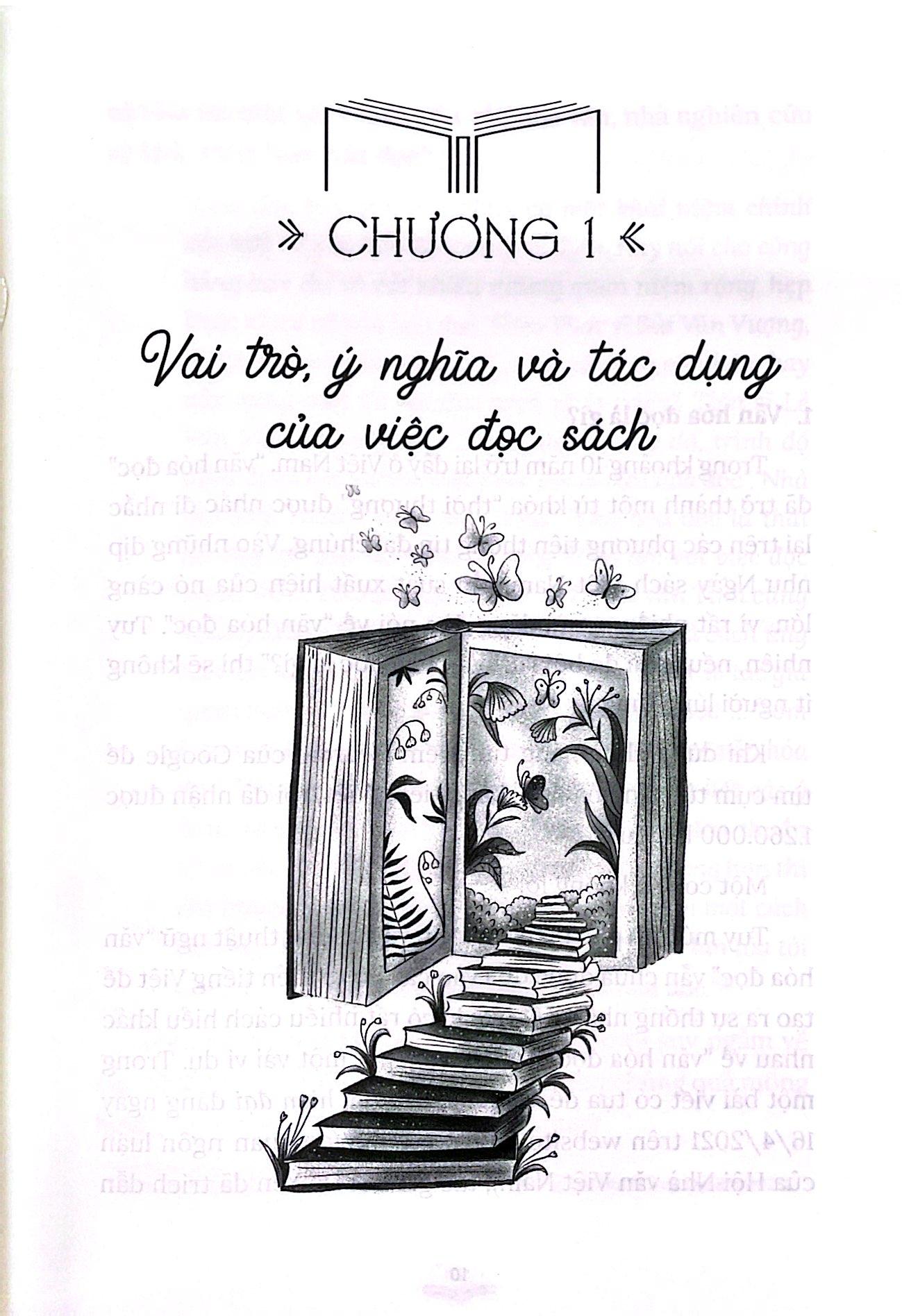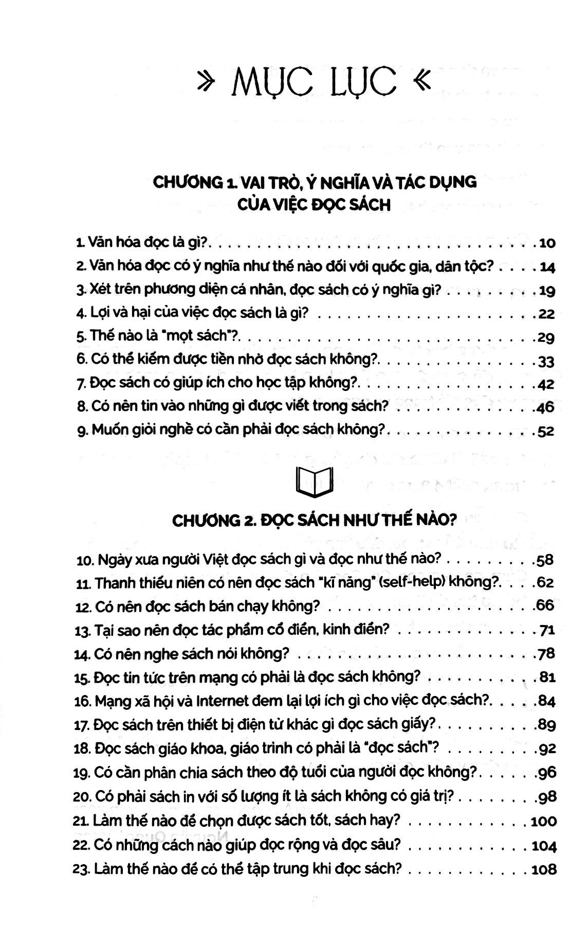 Nội dung cuốn sách xoay quanh các chủ điểm chính: Vai trò, ý nghĩa của việc đọc sách; Đọc sách như thế nào; Khuyến đọc cho trẻ và cho mọi người như thế nào. Bằng những chia sẻ tâm huyết của mình, tác giả Nguyễn Quốc Vương đã đưa ra lời gợi mở cho những câu hỏi thường gặp, như: “Liệu đọc sách có thể kiếm tiền không? Làm thế nào để chọn được sách tốt, sách hay? Nên làm gì khi đọc sách mà không hiểu? Bắt đầu đọc sách khi đã trưởng thành có phải là quá muộn?”