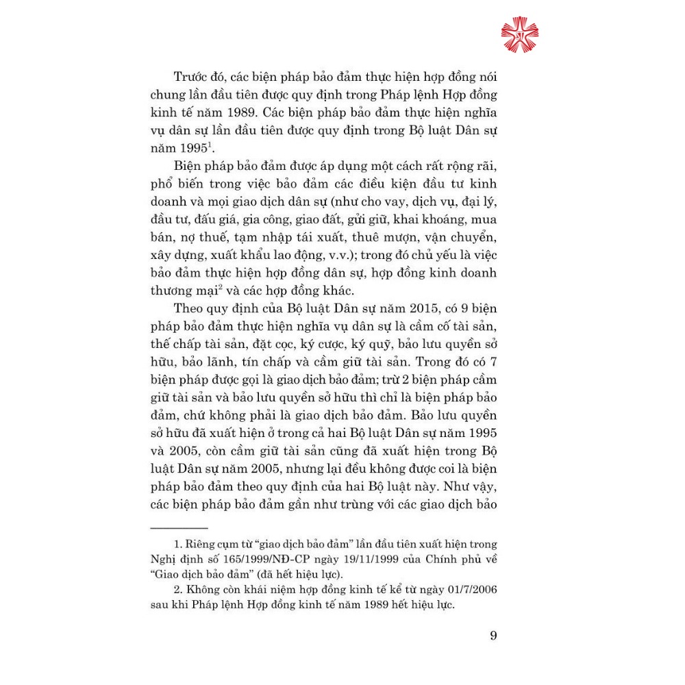 Với mục đích cung cấp cho bạn đọc những thông tin cơ bản về các biện pháp bảo đảm theo quy định của Bộ luật Dân sự năm 2015, Nghị định số 21/2021/NĐ-CP ngày 19/3/2021 quy định thi hành Bộ luật Dân sự về bảo đảm thực hiện nghĩa vụ, Nhà xuất bản Chính trị quốc gia Sự thật tái bản có sửa chữa, bổ sung cuốn sách: 9 biện pháp bảo đảm nghĩa vụ hợp đồng (Quy định, thực tế và thiết kế giao dịch theo Bộ luật Dân sự hiện hành) do Luật sư Trương Thanh Đức, Giám đốc Công ty Luật ANVI, Trọng tài viên Trung tâm trọng tài quốc tế Việt Nam (VIAC), thành viên Nhóm chuyên gia tư vấn xây dựng và thành viên Hội đồng thẩm định Dự án Bộ luật Dân sự biên soạn. Tác giả đã có hơn 30 năm nghiên cứu, trải nghiệm thực tiễn và hơn 40 bài viết chuyên sâu về giao dịch bảo đảm, đặc biệt là bảo đảm tiền vay của các ngân hàng thương mại. Trong cuốn sách này, tác giả đã phân tích, luận giải các biện pháp bảo đảm cả về quy định pháp lý và khả năng áp dụng trên thực tiễn, đồng thời gợi mở cách thức thực hiện cho các chủ thể tham gia giao dịch này.