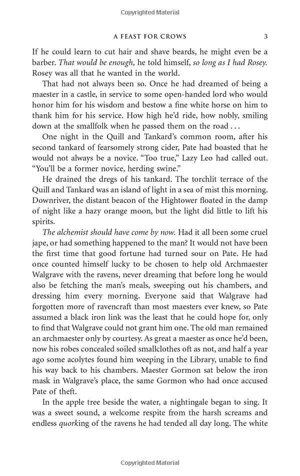After centuries of bitter strife, the seven powers dividing the land have beaten one another into an uneasy truce. Few legitimate claims to the Iron Throne still exist, and the war that has turned the world into little more than a wasteland has finally burned itself out. Or so it appears. For it’s not long before the survivors, outlaws, renegades, and carrion eaters of the Seven Kingdoms gather. Now, as the human crows assemble over a banquet of ashes, daring new plots and dangerous new alliances are formed, while surprising faces—some familiar, others only just appearing—emerge from an ominous twilight of past struggles and chaos to take up the challenges of the terrible times ahead. Nobles and commoners, soldiers and sorcerers, assassins and sages, are coming together to stake their fortunes . . . and their lives. For at a feast for crows, many are the guests—but only a few are the survivors.