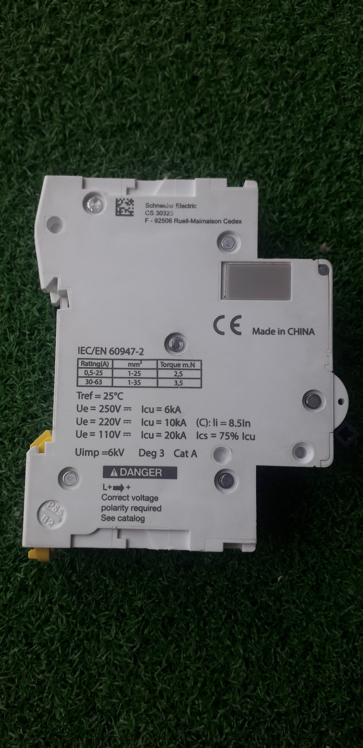 TÊN SẢN PHẨM MCB A9N61508 Schneider DÒNG Acti9 C60H-DC KÝ HIỆU MCB SỐ CỰC 1P DÒNG ĐỊNH MỨC 10A DÒNG CẮT NGẮN MẠCH 10kA ĐIỆN ÁP 220VDC TIÊU CHUẨN EN 60947-2, IEC 60947-2 KÍCH THƯỚC 18x81x73 NHIỆT ĐỘ MÔI TRƯỜNG -25°C-70°C NHIỆT ĐỘ BẢO QUẢN -40°C-85°C KHỐI LƯỢNG 128g