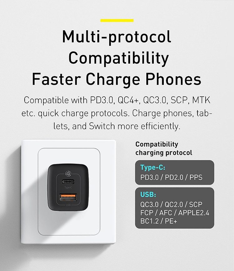 Củ sạc nhanh 65W đa năng USB & PD Type-C hiệu Baseus Ga2 Mini Quick Charger chuẩn sạc nhanh PD 3.0 & QC 4.0 Với 1 cổng USB & Type-C thiết bị này có thể hỗ trợ bạn sạc nhanh trên các thiết bị iphone, android hay cổng Type-C một cách an toàn và thông minh. Với cổng Type-C bạn sẽ có tốc độ sạc cực nhanh lên đến 65W chuẩn PD 3.0. Với cổng USB chuẩn dòng ra đạt chuẩn sạc nhanh QC 4.0.