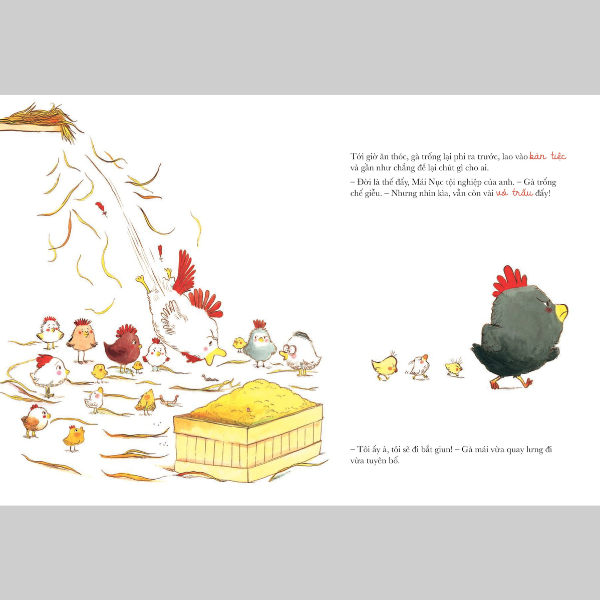 Ở chuồng gà, ngày nào chú gà trống cũng diễu qua diễu lại chế nhạo các cô gà mái và chỉ để lại cho chúng ít vụn thức ăn. Các cô gà mái đã chán ngấy cảnh này, chỉ biết thở dài và bịt tai lại.