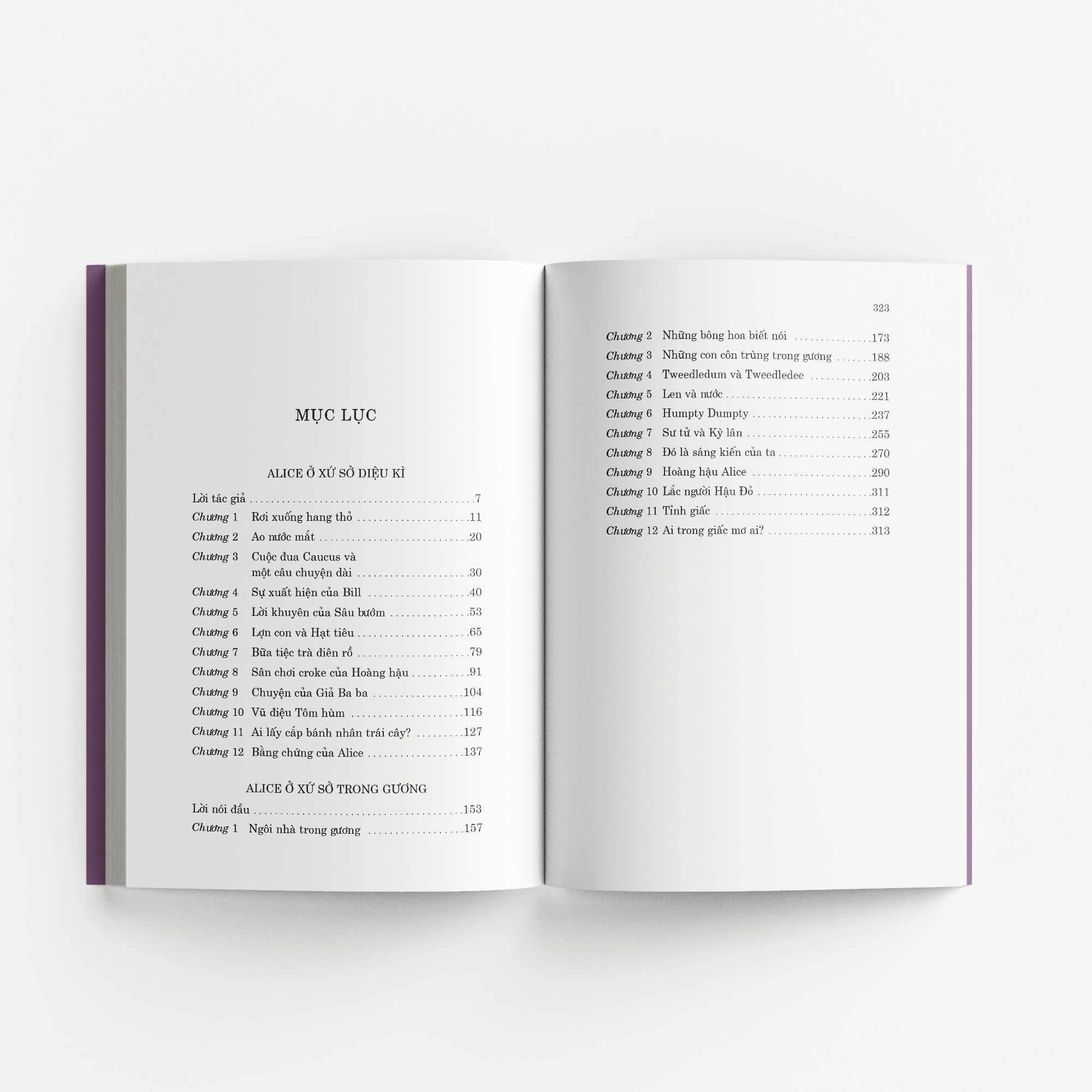 Alice ở xứ sở diệu kì và Alice ở xứ sở trong gương là hai cuốn tiểu thuyết thiếu nhi nổi tiếng của nhà văn người Anh, Lewis Carroll. Ngay khi Alice ở xứ sở diệu kì - phần 1 cuốn sách được xuất bản năm 1865, cuốn truyện đã được đông đảo bạn đọc cả trẻ em lẫn người lớn yêu mến. Bảy năm sau, Lewis Carroll cho ra mắt phần tiếp theo, Alice ở xứ sở trong gương, và ngay lập tức những nhân vật như cặp anh em Tweedledum, Hậu Đỏ, Hậu Trắng…của phần này cũng trở nên nổi tiếng không kém Thỏ Trắng, Sâu bướm, nữ Công tước hay Vua Cơ và Hậu Cơ ở phần trước.