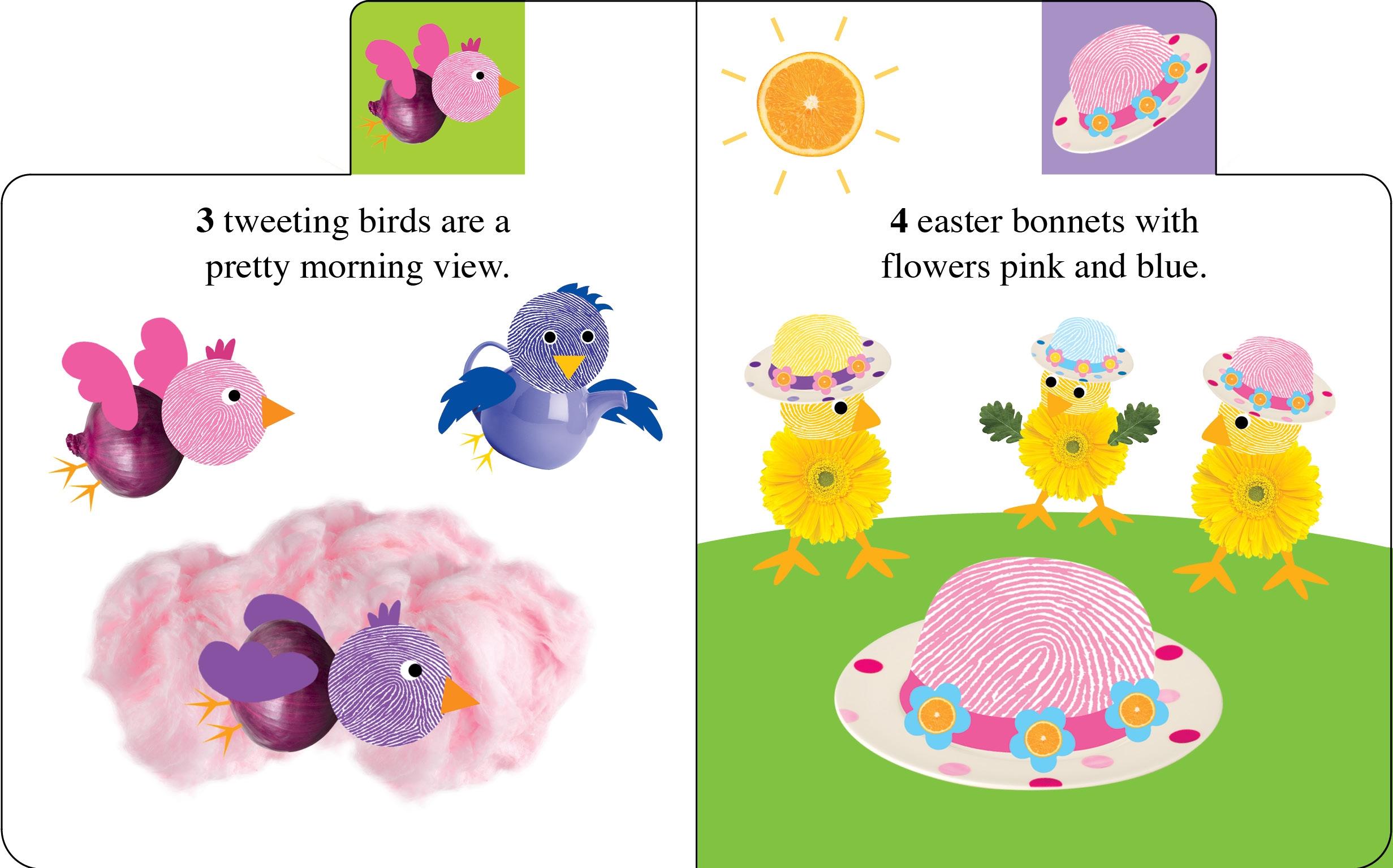 Alphaprints make learning to count fun in this Easter themed tab book. Sweet rhymes accompany Easter animals and items ingeniously created from fingerprints and photographs of everyday things. A tabbed board book treat to celebrate Easter and the arrival of Spring.