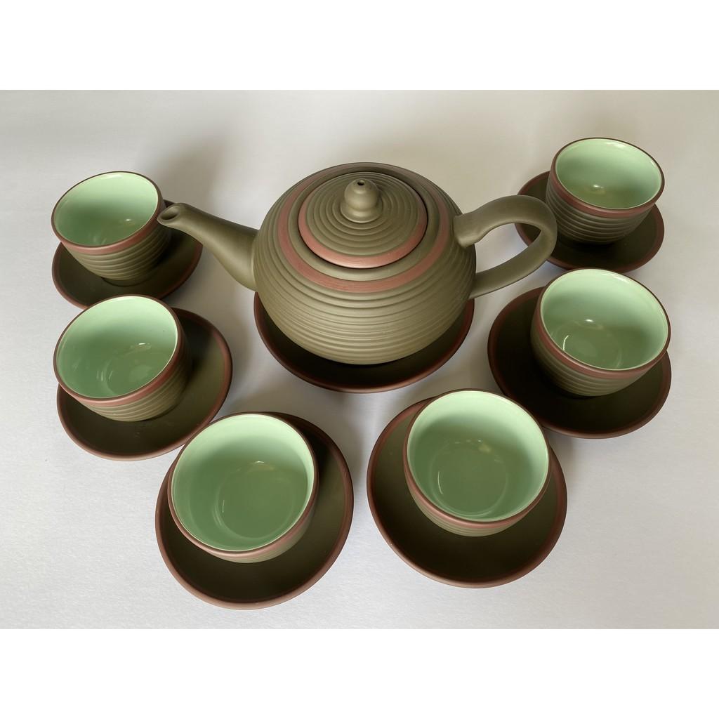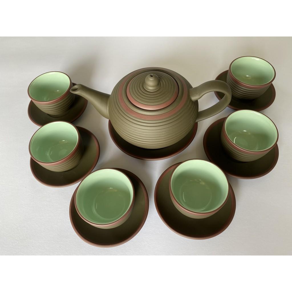 Ấm chén men xanh rêu đậm khắc hoạ tiết sen Gốm sứ Bát Tràng Bọc đồng cao cấp ĐẸP sang trọng và cuốn hút 1 ấm 6 chén 7 đĩa kê giá 1000k Phụ kiện