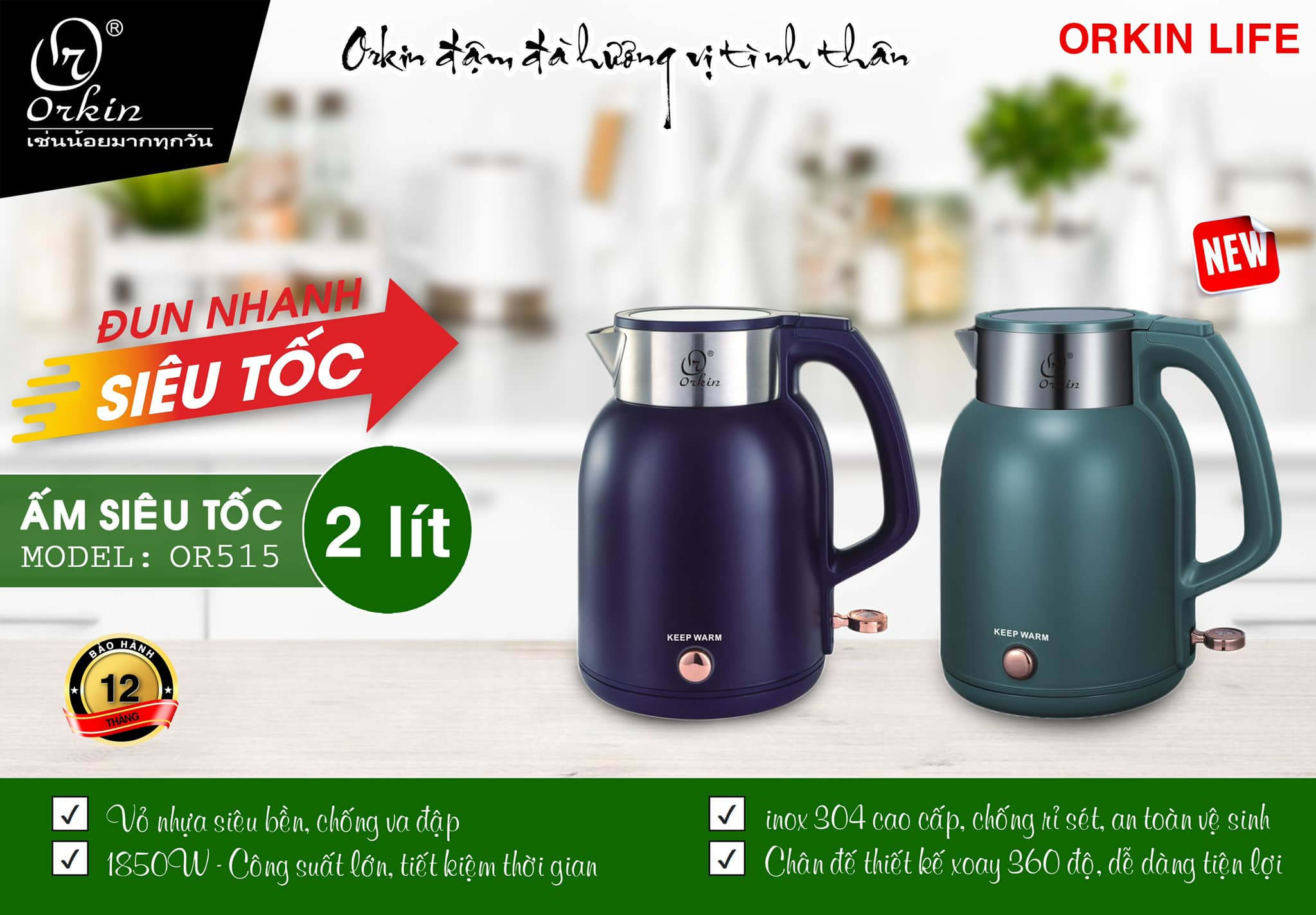 ✨Ấm đun nước siêu tốc Inox 304 giữ nhiệt Orkin Thái Lan OR515 dung tích 2 lít - Hàng chính hãng