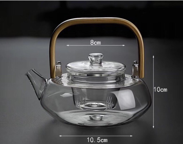 ấm pha trà thủy tinh có quai xách và nắp gỗ, lõi lọc trà Ấm chịu nhiệt nấu được trên bếp điện và bế