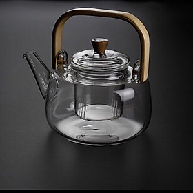 ấm pha trà thủy tinh có quai xách và nắp gỗ, lõi lọc trà Ấm chịu nhiệt nấu được trên bếp điện và bế