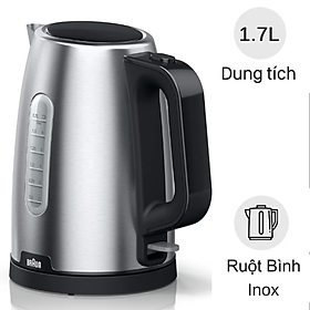 Bình đun siêu Braun WK1100BK - Công suất: 2200W – Dung tích: 1.7L - Chất liệu: Nhựa, an toàn với thực phẩm (BPA free) - Đun sôi trong 45s với 200ml - 4 chức năng