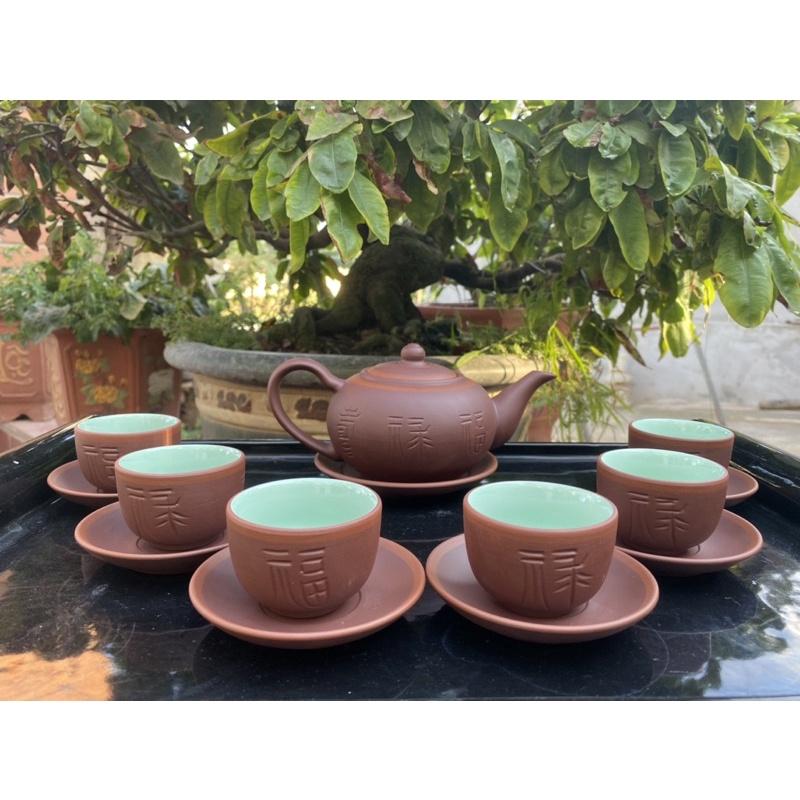 Ấm chén men xanh rêu đậm khắc hoạ tiết sen Gốm sứ Bát Tràng Bọc đồng cao cấp ĐẸP sang trọng và cuốn hút 1 ấm 6 chén 7 đĩa kê giá 1000k Phụ kiện