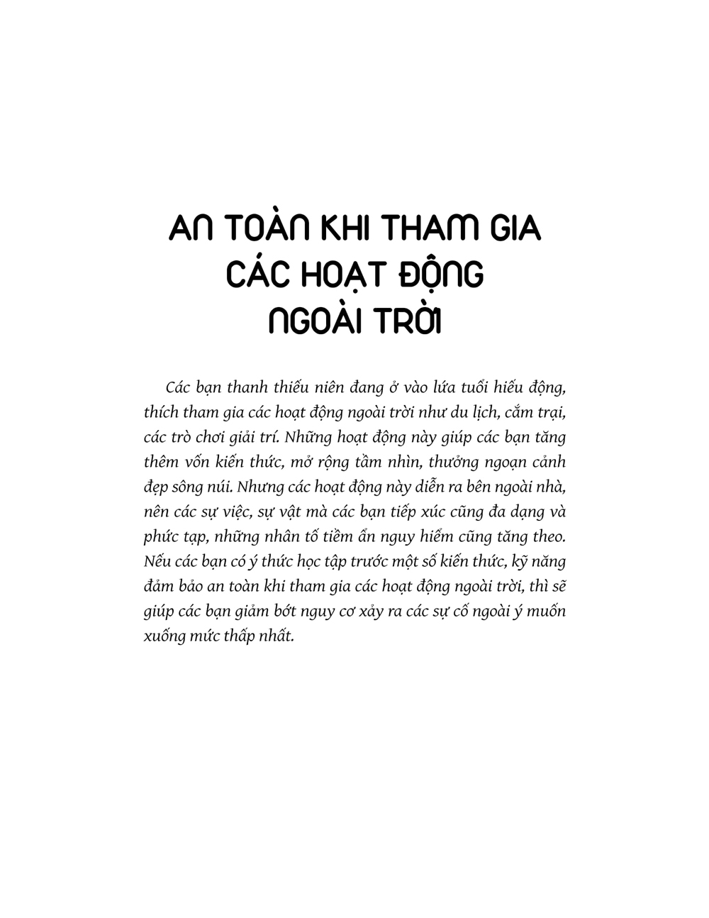 Mua tại TiktokAn toàn khi tham gia các hoạt động ngoài trời và phòng chống thiên tai cung cấp một số kiến thức, kỹ năng đảm bảo an toàn khi tham gia các hoạt động ngoài trời, hạn chế tối đa nguy cơ xảy ra các sự cố ngoài ý muốn; những đặc trưng, quy luật của thiên tai để từ đó đưa ra những dự đoán và biện pháp phòng chống, giúp tự bảo vệ an toàn của bản thân, giảm thiểu những tổn thất do thiên tai gây ra xuống mức thấp nhất.