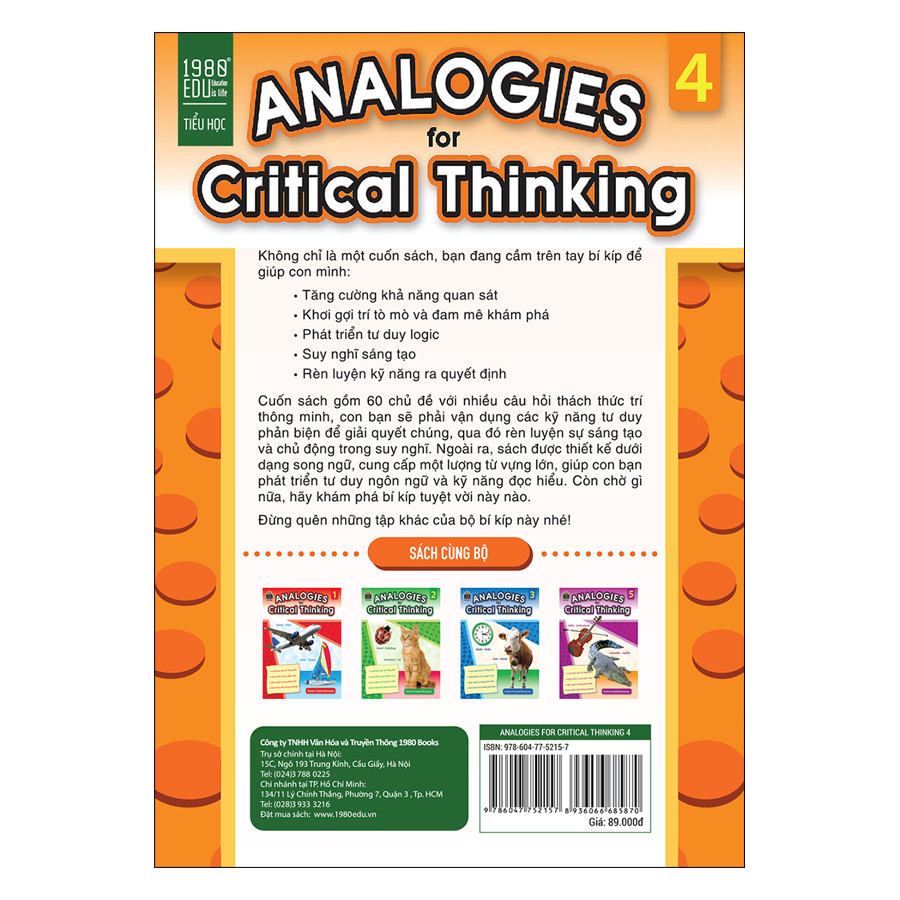 Bộ sách “Analogies for Critical Thinking” gồm 5 cuốn, được trình bày dưới dạng song ngữ Anh Việt, bao gồm những bài tập với mục tiêu phát triển tư duy dành cho trẻ em từ 6 – 12 tuổi.