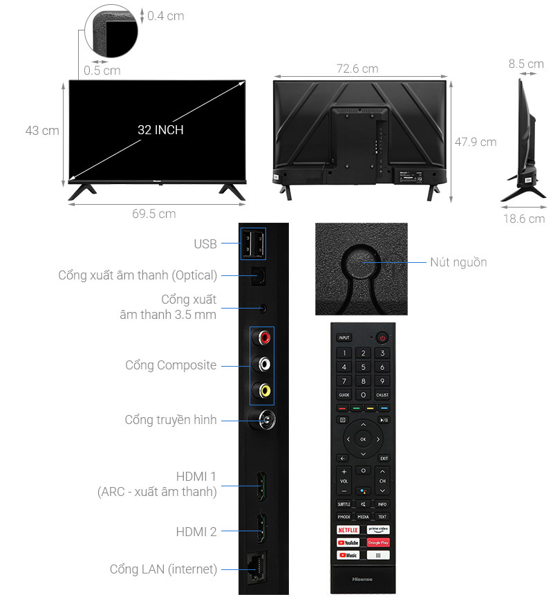 - Hệ thống loa 2 kênh với công suất 16W đáp ứng tốt nhu cầu nghe nhạc, xem phim của bạn trên tivi Hisense 32 inch.