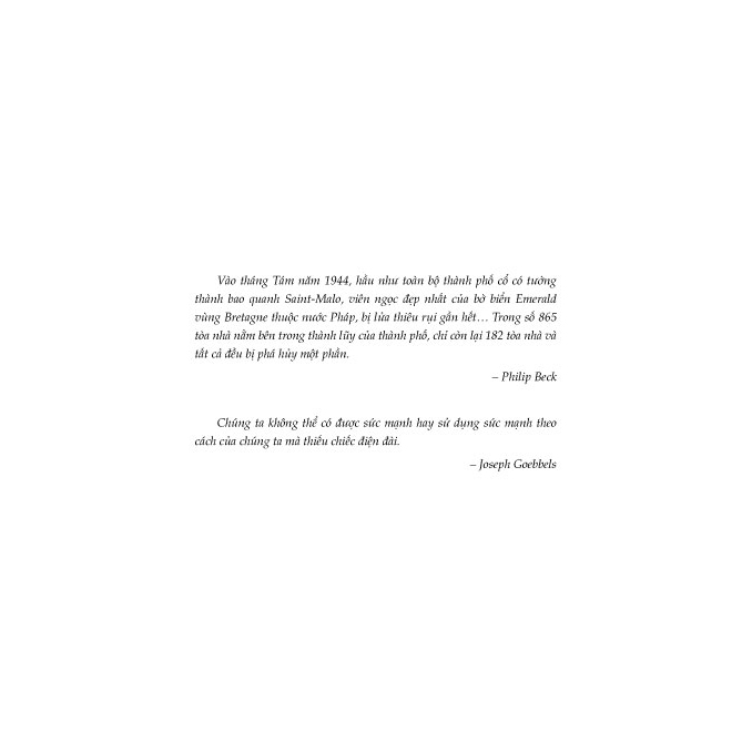 “Marie Laure sống cùng cha tại Paris, gần bảo tàng Lịch sử tự nhiên, nơi cha cô làm thợ khóa chính. Khi lên 6 tuổi, Marie Laure bị mù. Cha cô đã dựng một mô hình thu nhỏ hoàn chỉnh về khu phố hai cha con đang sống để cô có thể ghi nhớ bằng cách chạm và lần tìm đường về nhà. Năm Marie Laure 12 tuổi, Đức Quốc xã chiếm giữ Paris, cô cùng cha chạy trốn đến thành phố nằm trong tường thành, Saint-Malo, nơi ông chú thích ẩn dật của cha cô sống trong một ngôi nhà cao ven biển. Hai cha con họ đã mang theo một viên đá quý giá trị nhất và cũng nguy hiểm nhất viện bảo tàng.