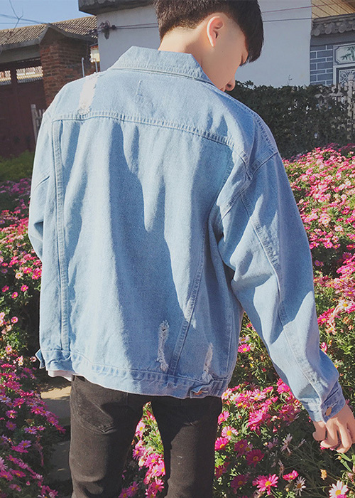 Quần jean nam ống rộng phối áo thun với áo khoác jean cho anh em thích phong cách Hàn Quốc