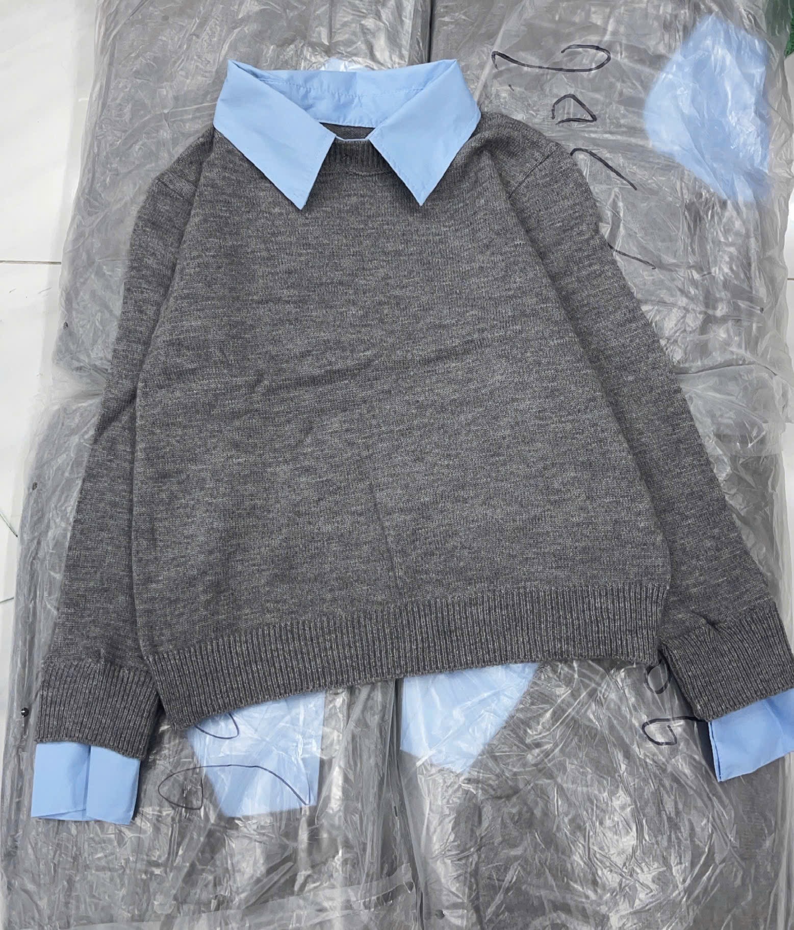 Áo Len Xám Mix Cổ Sơ Mi Xanh – item thời trang trẻ trung, dễ phối đồ Thiết kế: Áo len xám basic, điểm nhấn cổ sơ mi xanh nổi bật, mang đến phong