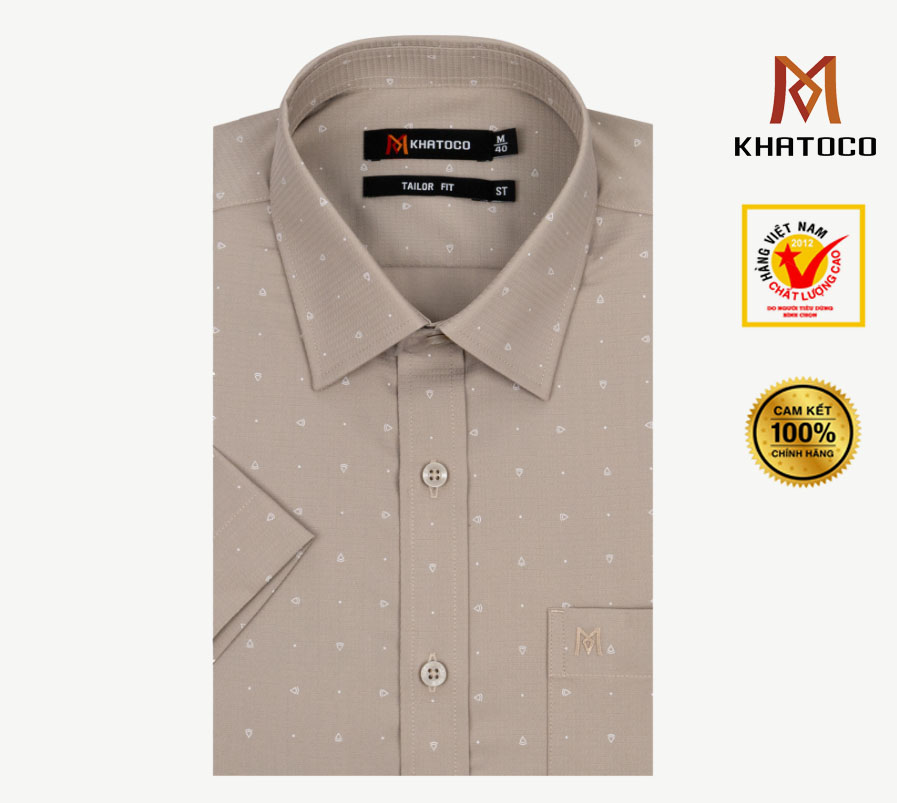 ÁO SƠ MI NAM TAY NGẮN KHATOCO - TAILOR FIT Kiểu dáng: Tailor Fit - Ôm nhẹ, tôn dáng, lịch sự Màu sắc: Be sáng (họa tiết tam giác nhỏ trắng, tinh tế) Size: L – XL – 2XL ️ Thương hiệu: KHATOCO – Hàng Việt Nam chất lượng cao