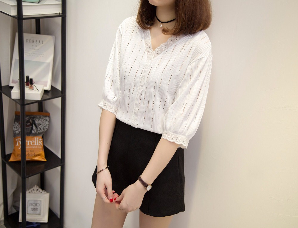 ✨Áo sơ mi nữ công sở cổ V thanh lịch, họa tiết trơn phối viền ren siêu xinh, phong cách Hàn Quốc HB185