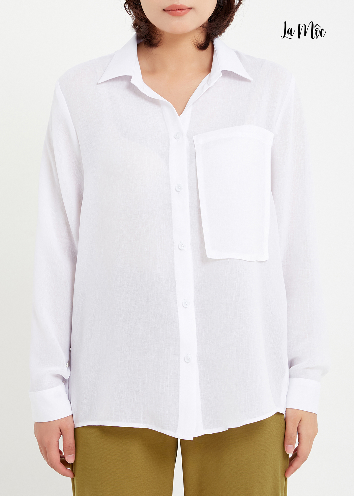 Áo sơ mi, áo công sở LA MỘC, áo sơ mi trắng, tay dài, có túi, chất liệu cotton, hàng thiết kế "- Sơ mi trắng phối túi tạo điểm nhấn với thiết kế cơ
