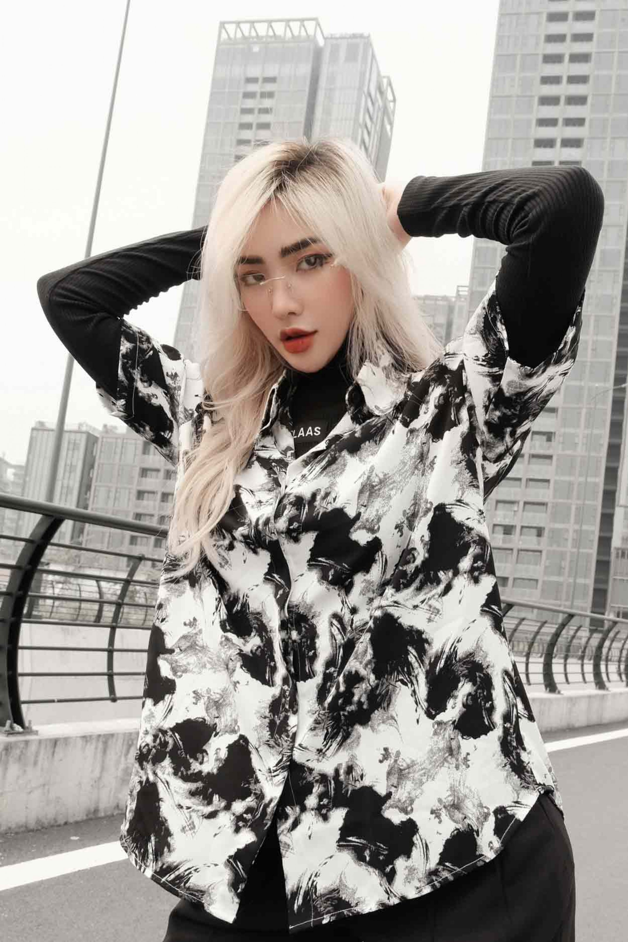 CHẤT LIỆU MANGO, MỀM MƯỢT, KHÔNG NHĂN ÁO MÀU TRẮNG, HOẠ TIẾT MÀU ĐEN ÁO SOMI NẸP GIẤU NÚT FORM RỘNG FREESIZE ĐIỂM NHẤN 1 BÊN TAY PHẢI ÁO GẮN TAG LOGO LAAS