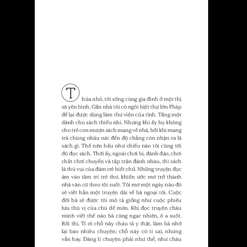 • "Thủa nhỏ, tôi sống cùng gia đình ở một thị xã yên bình, gần nhà tôi có ngôi biệt thự lớn Pháp để lại được dùng làm thư viện của tỉnh, tầng một dành cho sách thiếu nhi. Nhưng khi ấy họ không cho trẻ con mượn sách mang về nhà, bởi khi mang trả chúng nhàu nát đến độ chẳng còn nhận ra là sách gì. thế nên hầu như chiều nào tôi cũng tới đó đọc sách. Thời ấy, ngoài chơi bi, đánh đáo, chơi chắt chơi chuyền và tập trận đánh nhau, thì sách là thú vui của đám trẻ biết chữ. Những truyện đọc ám vào tâm trí trẻ thơ, khiến ước mơ trở thành nhà văn cứ theo tôi suốt. Tôi mơ một ngày nào đó sẽ viết hẳn một truyện dài về bà ngoại tôi, cuộc đời bà sẽ được tôi mô tả giống như cuộc phiêu lưu thú vị của chú dế mèn. Khi đọc truyện cháu mình viết thể nào bà cũng ngạc nhiên, ô a suốt. Rồi thì, tí ơi chỗ này cháu tả y thật, làm bà nhớ lại bao nhiêu chuyện; chỗ này có tí sai, nhưng vẫn hay. đáng lí chuyện phải như thế, như cháu viết ấy, mới đúng... truyện về bà ngoại, người bà có sức hút bí ẩn đối với tôi, có lẽ là truyện được viết lâu nhất thế giới. Bởi vì, cho tới tận hôm nay, khi tôi đã bằng tuổi bà trong lần gặp cuối cùng, bất chợt dòng kí ức tuổi thơ tôi cuồn cuộn đổ về lẫn với mùi mưa phùn pha gió bấc tháng ba và mùi hoa nhãn thoảng qua ngoài cửa sổ, và thế là cầm bút. ..."