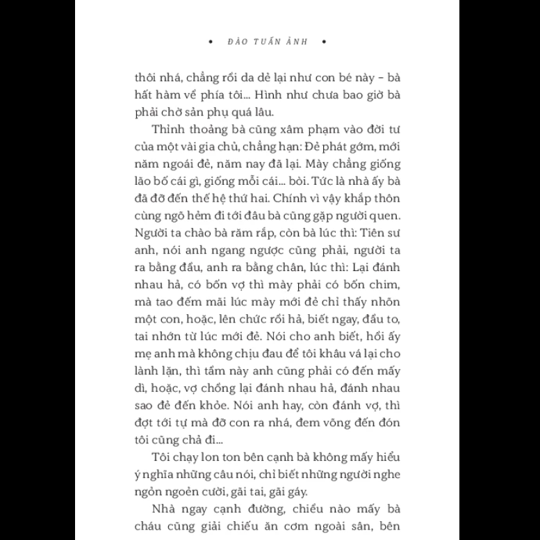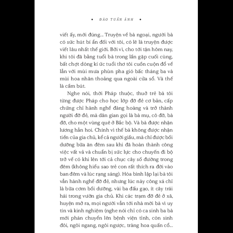 • Hồi ký “Bà Đỡ” của dịch giả, nhà nghiên cứu văn học Đào Tuấn Ảnh gồm có ba phần. Riêng phần đầu, kể chuyện bà ngoại là chủ yếu, đã chiếm đến một nửa dung lượng bản thảo. Hai phần sau, “Chuyến du lịch đầu tiên” và “Cô Tí Hon”, kể chuyện những người thân khác trong gia đình. Xa, là chuyện về thời con gái của người mẹ đẻ, tức cô Tí Hon, giờ đã ngoại cửu tuần; gần, là chuyện về những đứa cháu, con cháu của cô Hon, đứa em gái có dòng máu Tây lai mà vợ chồng cô Tí Hon nhận nuôi thuở trước. Luôn có một giọng kể nghèn nghẹn như kìm nén nỗi xúc động khi nhớ lại những cơ cực oan trái, những hy sinh thầm lặng, những trớ trêu sự đời trong cuộc đời và số phận những người thân trong gia đình của tác giả.