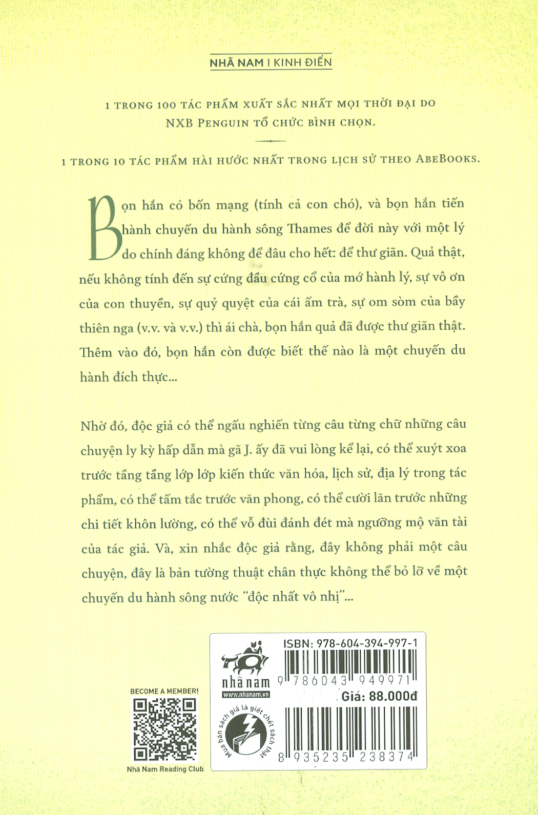Nhờ đó, độc giả có thể ngấu nghiến từng câu từng chữ những câu chuyện ly kỳ hấp dẫn mà gã J. ấy đã vui lòng kể lại, có thể xuýt xoa trước tầng tầng lớp lớp kiến thức văn hóa, lịch sử, địa lý trong tác phẩm, có thể tấm tắc trước văn phong, có thể cười lăn trước những chi tiết khôn lường, có thể vỗ đùi đánh đét mà ngưỡng mộ văn tài của tác giả. Và, xin nhắc độc giả rằng, đây không phải một câu chuyện, đây là bản tường thuật chân thực không thể bỏ lỡ về một chuyến du hành sông nước “độc nhất vô nhị”…