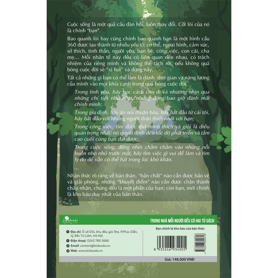 Đọc cuốn sách Bạn Chính Là Kho Báu Của Bản Thân này mới thấy rằng, mỗi sinh mệnh chúng ta giống như một quả cầu đàn hồi và không ngừng thay đổi vậy - Cốt lõi của nó chính là bản thân bạn. Quả cầu này còn được tạo thành bởi nhiều khía cạnh như: Sức khoẻ, ngoại hình, cảm xúc, sở thích, sự theo đuổi giá trị tinh thần, vợ/chồng, bạn bè, công việc, con cái hay bố mẹ… Tất cả những điều này tạo nên sinh mệnh. Chúng vừa gắn kết với nhau vừa có khả năng tự mình đảm đương công việc của riêng chúng, mỗi khía cạnh đều không thể bị rò rỉ, cũng không thể mất đi, nếu không, quả cầu sinh mệnh sẽ dần xẹp xuống, thậm chí không thể bật lên được nữa. Cuộc sống là sự viên mãn mà bạn tự theo đuổi, là quả cầu hoạt động luôn biến hoá không ngừng.