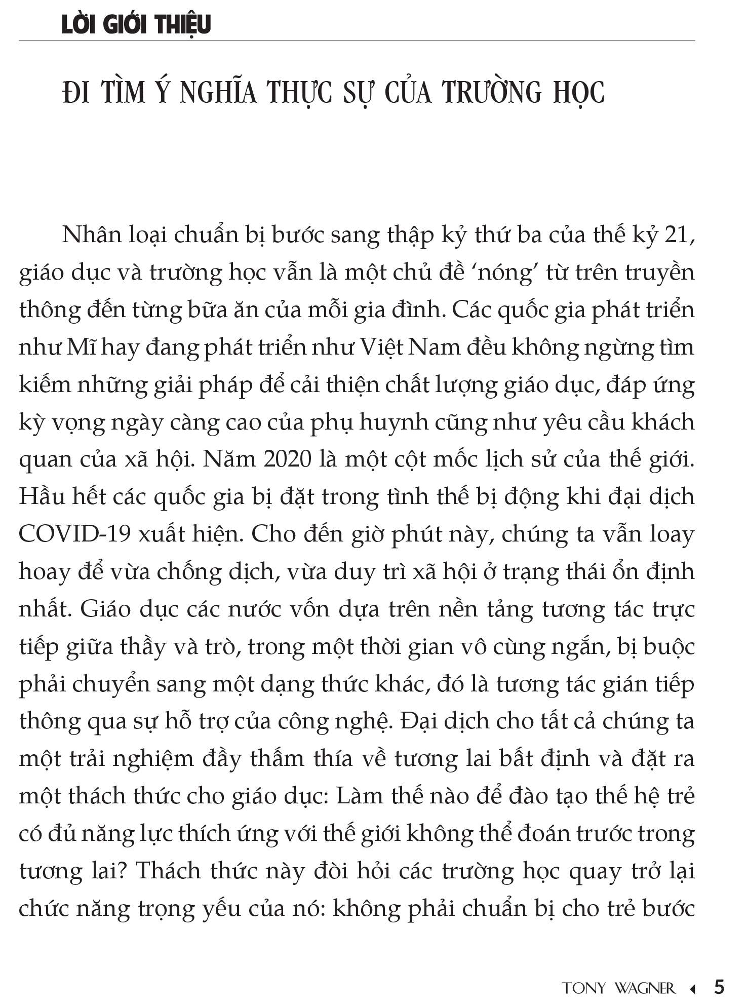 Để trả lời cho những câu hỏi đó, chuyên gia giáo dục Tony Wagner đã tiến hành nghiên cứu các trường học ở Mĩ và đúc kết bằng thông điệp: Ý nghĩa thực sự của trường học là tạo ra những con người có khả năng đạt được thành công và hạnh phúc trong cuộc sống thực , không phải là điểm số hay thứ hạng cao trong các kỳ thi. Thông điệp này được ông thể hiện xuyên suốt trong cuốn sách Bài học giáo dục từ nước Mĩ.