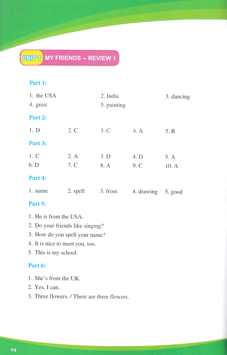 Phần 1: Unit Review and Tests (Các đề ôn tập và bài kiểm tra). Các đề ôn tập trong phần này sẽ được trình bày dưới dạng các bài luyện tập theo từng unit (Unit Review). Sau mỗi 2 hoặc 4 unit sẽ có một bài kiểm tra (Test) tương ứng với từng học kì để học sinh có thể tự kiểm tra .