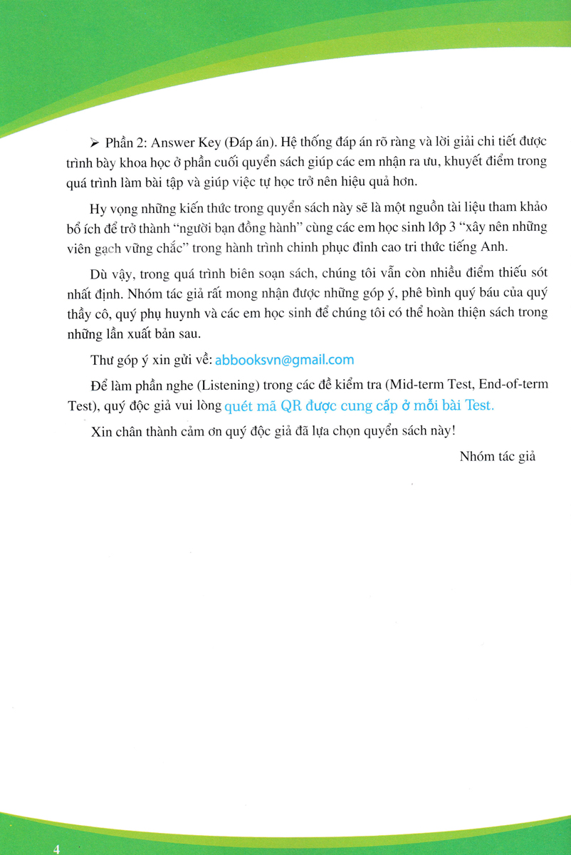 Hy vọng những kiến thức trong quyển sách này sẽ là một nguồn tài liệu tham khảo bổ ích để trở thành “người bạn đồng hành” cùng các em học sinh lớp 3 “xây nên những viên gạch vững chắc” trong hành trình chinh phục đỉnh cao tri thức tiếng Anh.