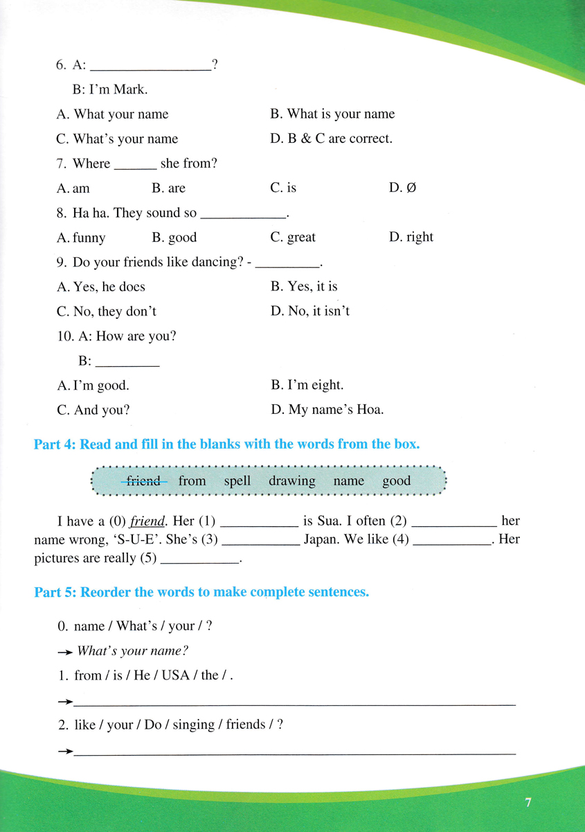 Quyển sách sẽ tập hợp đa dạng các bài tập và đề kiểm tra về ngữ âm, từ vựng, ngữ pháp, và đặc biệt là năng lực giao tiếp bằng tiếng Anh thông qua bốn kĩ năng Nghe, Nói, Đọc, Viết. Đây chính là một nguồn học liệu phong phú giúp các em có thể tự ôn tập, củng cố kiến thức đã được học trên lớp; tự kiểm tra đánh giá trình độ tiếng Anh sau mỗi tiết học hoặc sau mỗi học kì; cũng như cung cấp tư liệu cho giáo viên tổ chức ôn tập trên lớp theo từng đơn vị bài học. Đặc biệt quyển sách này cũng hỗ trợ phụ huynh học sinh cùng con học tập tại nhà để việc quản lí, kiểm soát chất lượng học tập môn học trở nên dễ dàng hơn.