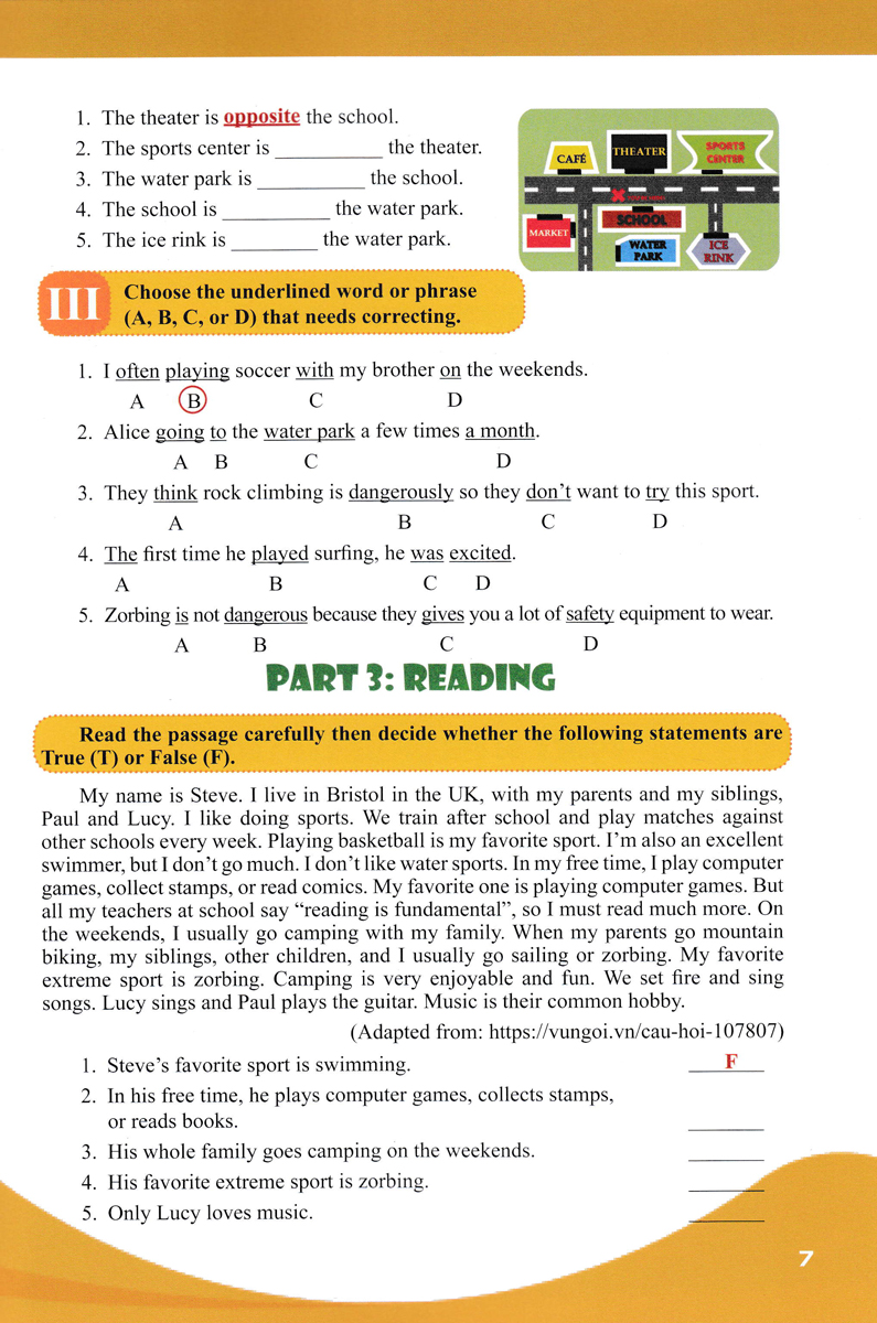 Phần 1: Unit Review and Tests (Các đề ôn tập và bài kiểm tra). Các đề ôn tập trong phần này sẽ được trình bày dưới dạng các bài luyện tập theo từng unit (Unit Review). Sau mỗi 2 hoặc 4 unit sẽ có một bài kiểm tra (Test) tương ứng với từng học kì để học sinh có thể tự kiểm tra .
