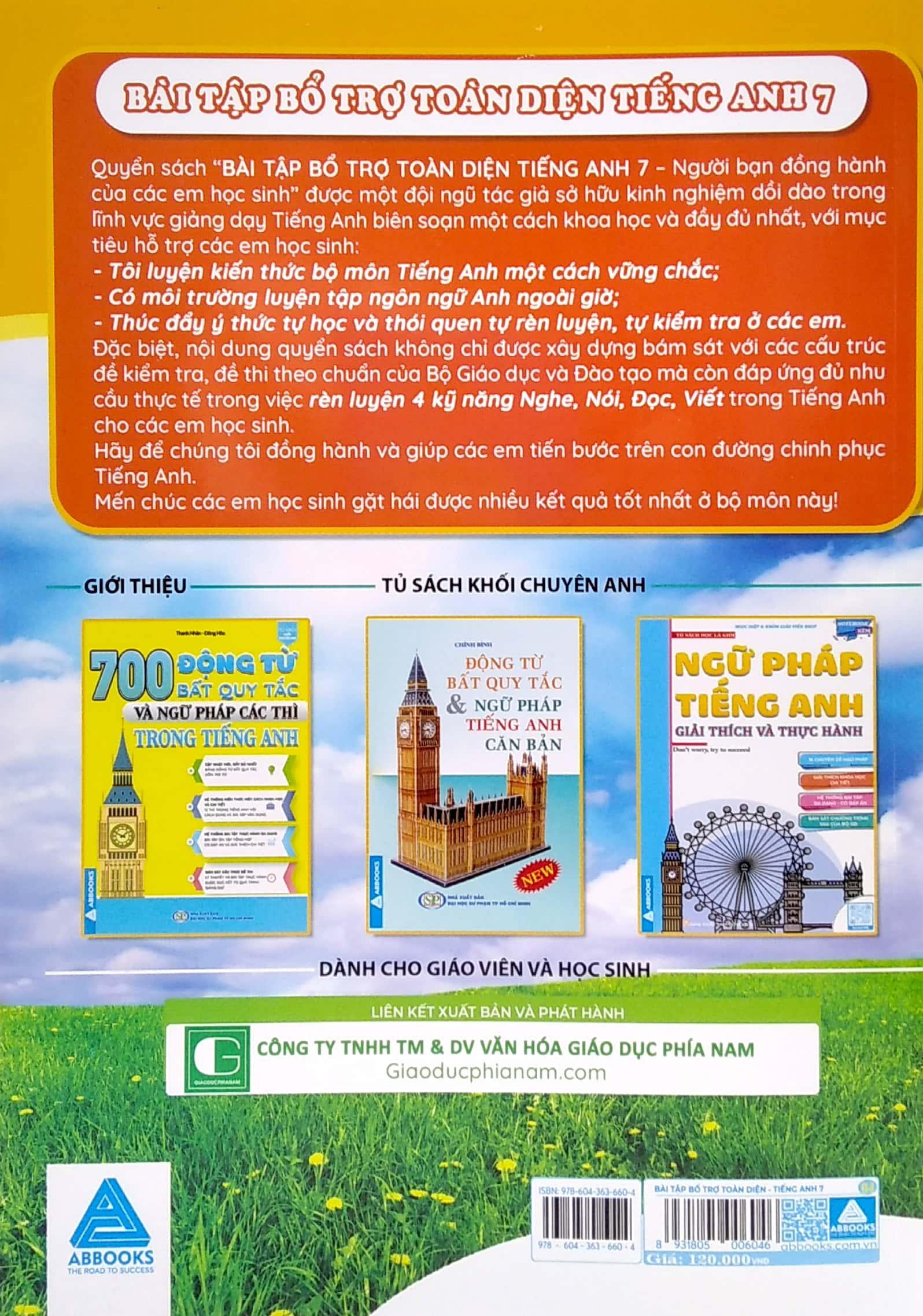 Hiểu rõ được những khó khăn đó, nhóm tác giả chúng tôi đã biên soạn quyển sách “BÀI TẬP BỎ TRỢ TOÀN DIỆN TIẾNG ANH 7 - Người bạn đồng hành của các em học sinh theo Chuẩn Chương trình giáo dục phổ thông môn Tiếng Anh năm 2018 của Bộ Giáo dục và Đào tạo và đặc biệt bám sát theo từng unit của sách giáo khoa Tiếng Anh 7 theo chương trình mới. Quyển sách sẽ tập hợp đa dạng các bài tập và đề kiểm tra về ngữ âm, từ vựng, ngữ pháp, và đặc biệt là năng lực giao tiếp bằng tiếng Anh thông qua bốn kĩ năng Nghe, Nói, Đọc, Viết. Đây chính là một nguồn học liệu phong phú giúp các em có thể tự ôn tập, củng cố kiến thức đã được học trên lớp; tự kiểm tra đánh giá trình độ tiếng Anh sau mỗi tiết học hoặc sau mỗi học kì; cũng như cung cấp tư liệu cho giáo viên tổ chức ôn tập trên lớp theo từng đơn vị bài học. Đặc biệt quyển sách này cũng hỗ trợ phụ huynh học sinh cùng con học tập tại nhà để việc quản lí, kiểm soát chất lượng học tập môn học trở nên dễ dàng hơn.