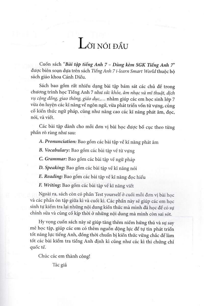 Hy vọng với sự say mê học tập và mong muốn được phát triển hơn ở môn Tiếng Anh lớp 7, cuốn sách này sẽ giúp các em nắm vững kiến thức và đạt điểm cao trong các bài thi và kiểm tra định kì .