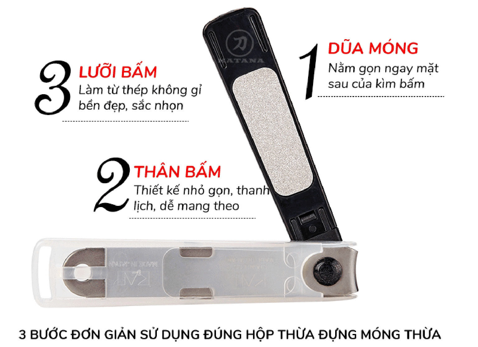 - Công dụng: Dùng để mài/ dũa, cắt tỉa móng tay, móng chân thích hợp cho việc làm Nail, Cấu tạo lưỡi cắt sắc, bén với tay cầm gọn và dễ sử dụng. đặc biệt, phần bọc nhựa được thiết kế dùng để làm nơi chứa móng tay trong khi cắt, bấm nên rất gọn gàng và sạch sẽ.