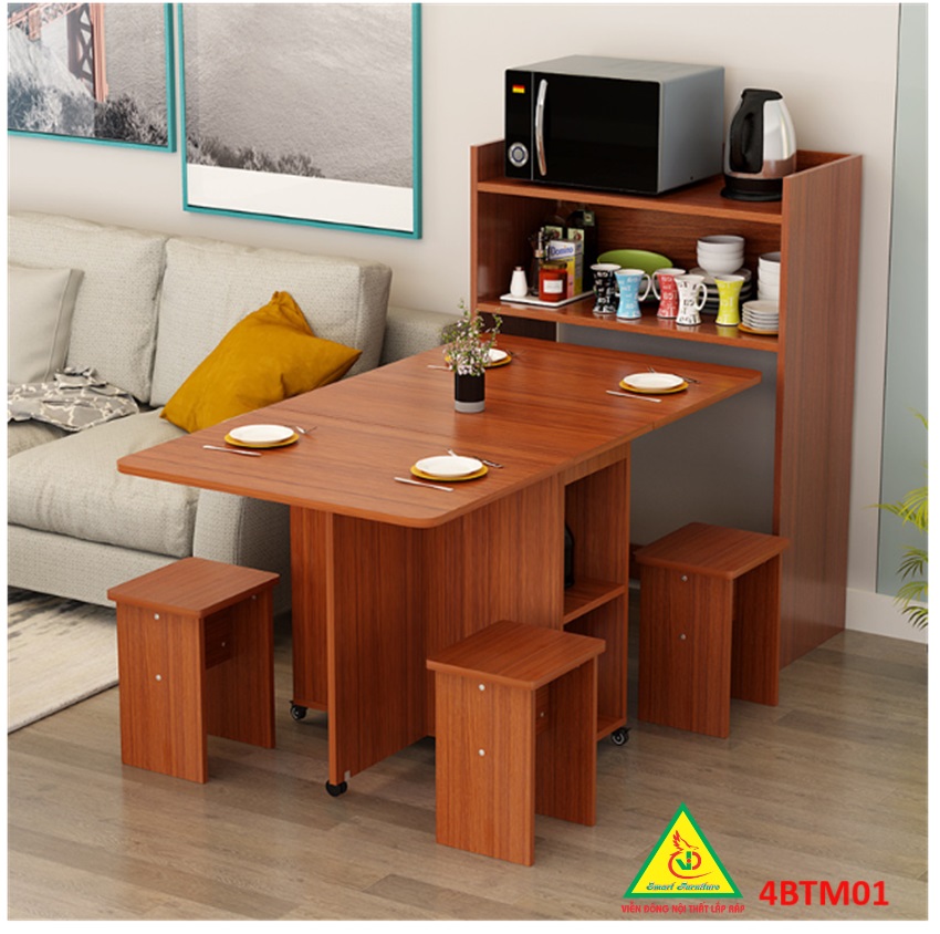 Bàn ăn gấp gọn thông minh Với các gia đình có diện tích phòng ăn không lớn lắm thì Bàn ăn gấp gọn này chính là sự lựa chọn lý tưởng nhất. Bàn ăn có kích thước nhỏ gọn, kết cấu thông minh có thể gấp gọn lại khi không sử dụng tiết kiệm diện tích. Bàn được làm bằng gỗ công nghiệp MDF cao cấp phủ melamine láng mịn, tính thẩm mỹ cao thu hút được sự chú ý của khách hàng. Tích hợp 3 in 1: Bàn, Tủ và Kệ thật Sang - Chảnh - Đẳng Cấp Dù nhà lớn hay nhỏ thì chiếc Bàn Ăn Thông Minh sẽ làm không gian gọn gàng hơn, thoáng hơn và đẹp hơn.