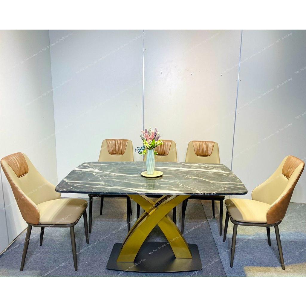 ✨Bàn ăn mặt đá Cẩm thạch nhân tạo chân chéo X cong inox mạ vàng kết hợp ghế Spot